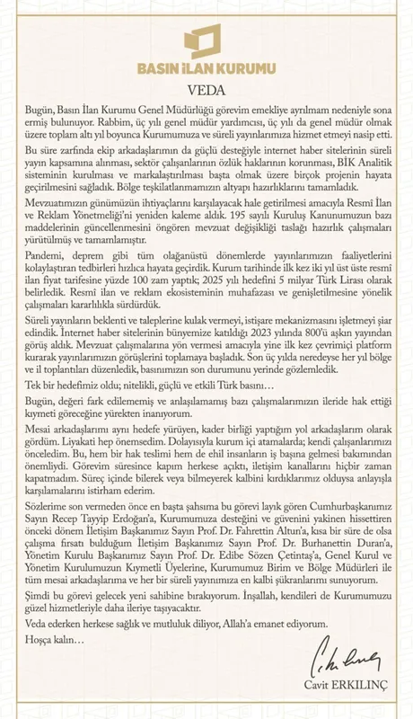 Mesajında, görev süresinde hayata geçirilen çalışmaları da özetleyen Erkılınç, internet haber sitelerinin resmi ilan kapsamına alınması, sektör çalışanlarının özlük haklarının korunması, BİK Analitik sisteminin kurulması ve markalaşma süreçleri ile Resmİ İlan ve Reklam Yönetmeliği'nin revizyonu ile 195 sayılı Kuruluş Kanunu'nda değişiklik taslağının tamamlanması yönündeki çalışmaları anlattı.