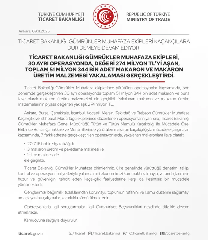 Ticaret Bakanlığı Gümrükler Muhafaza ekipleri, 30 ayrı operasyonda 51 milyon 344 bin adet makaron ve üretim malzemesi yakaladı. Operasyonlarda Bursa, İstanbul, Çanakkale ve Mersin'de 7 adrese baskın yapıldı.