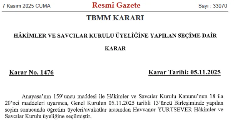 TBMM'nin 1476 sayılı kararı Resmi Gazete'de yayımlandı. Hâkimler ve Savcılar Kurulu'na (HSK) Havvanur Yurtsever'in üyeliği onaylandı.