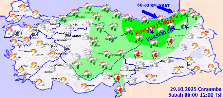 Meteoroloji'ye göre yurdun büyük bölümünde sağanak yağışlar etkili olacak. Karadeniz, İç Anadolu ve bazı batı illerinde kuvvetli yağış bekleniyor. Rüzgar, Karadeniz kıyılarında fırtına şeklinde esecek.