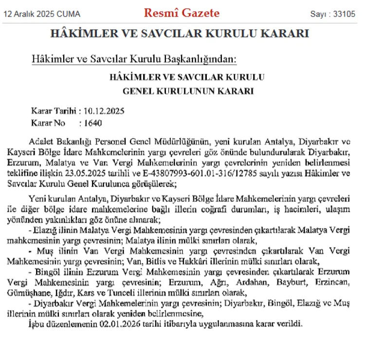 Hâkimler ve Savcılar Kurulu (HSK) Genel Kurulu'nun 10 Aralık 2025 tarihli ve 1640 sayılı Kararı, bugünkü Resmi Gazete'de yayımlanarak yürürlüğe girdi. Yeni Bölge Adliye Mahkemeleri etkisiyle mahkemeler yeniden düzenlendi.