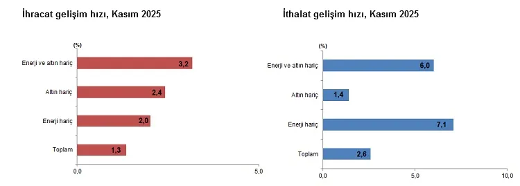 TÜİK verilerine göre Kasım 2025'te ihracat yüzde 1,3, ithalat yüzde 2,6 arttı. Dış ticaret açığı aylık bazda yüzde 6,3 yükseldi. TÜİK verileri, 2025 Kasım ayında dış ticarette artışın sürdüğünü ancak ithalattaki daha hızlı yükselişin dış ticaret açığını büyüttüğünü ortaya koydu.