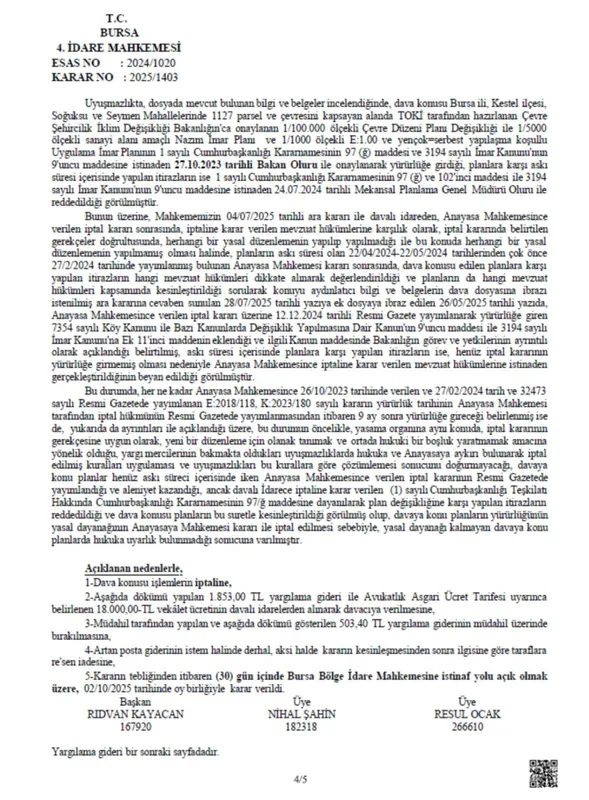 İMO Bursa, Kestel Soğuksu davasını kazandı... Plan iptal edildi!