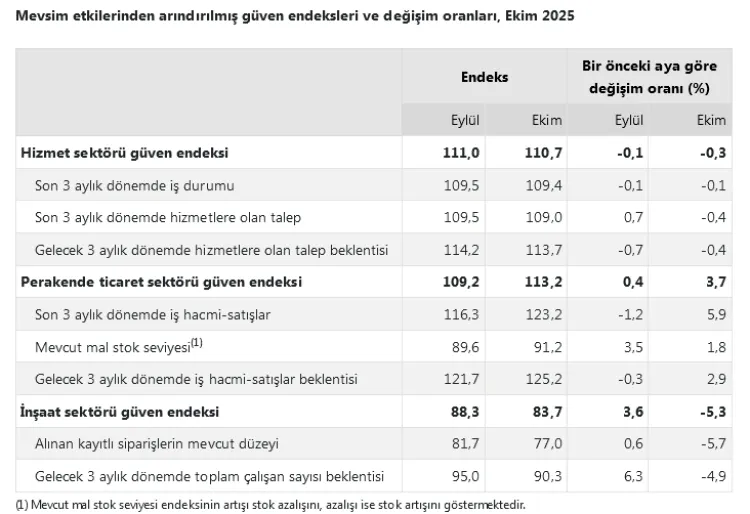 TÜİK'in Ekim 2025 verilerine göre, sektörlerde güven endeksleri farklı yönlerde hareket etti. İnşaat sektörü gerilerken, perakende ticaret sektörü yükseldi; hizmet sektöründe ise hafif bir düşüş yaşandı.