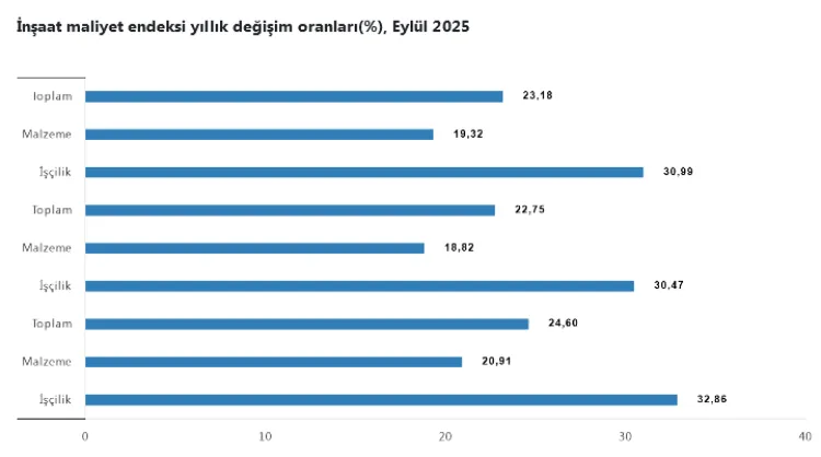 TÜİK verilerine göre, 2025 Eylül ayında inşaat maliyet endeksi bir önceki aya göre yüzde 0,87, yıllık bazda ise yüzde 23,18 yükseldi. Veriler, özellikle işçilik maliyetlerindeki yüksek artışın, inşaat sektöründe fiyat baskısına yol açtığını ortaya koydu.