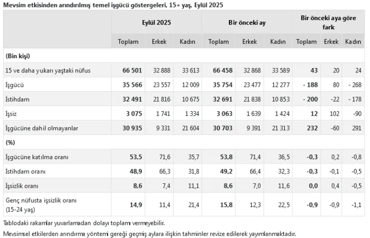 TÜİK'in Hanehalkı İşgücü Araştırması sonuçlarına göre, Eylül 2025'te Türkiye'de mevsim etkisinden arındırılmış işsizlik oranı yüzde 8,6 seviyesinde sabit kaldı. Genç nüfusta işsizlik ise bir önceki aya göre düşüş göstererek yüzde 14,9 oldu.
