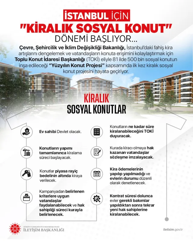 Çevre, Şehircilik ve İklim Değişikliği Bakanlığı, "Yüzyılın Konut Projesi" kapsamında İstanbul'da TOKİ eliyle kiralık sosyal konutlar inşa edecek. 81 ilde 500 bin sosyal konut hedefiyle, megakentin deprem riski ve kira yükü sorununa çözüm aranacak.