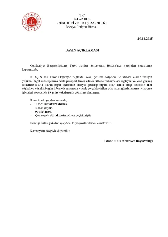 İstanbul Cumhuriyet Başsavcılığı, DEAŞ terör örgütü ile bağlantılı 15 şüpheliye yönelik eş zamanlı operasyon düzenledi. Operasyon sonucunda 13 kişi yakalanarak gözaltına alındı.