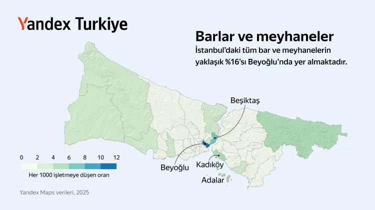 Barlar ve Meyhaneler: Kadıköy ve Adalar ilçelerinde, bar ve meyhane oranı İstanbul genelindeki ortalamanın 2,6 kat daha üzerinde. Bu oran Beşiktaş'ta 3,4 kat, Beyoğlu'nda ise tam 6 kat daha yüksek. Beyoğlu'nda her bin işletmeye 11 bar ve meyhane düşüyor. İstanbul'daki tüm bar ve meyhanelerin yaklaşık yüzde 16'sı bu ilçede bulunuyor.