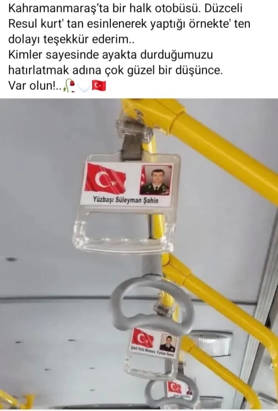 Kahramanmaraş'ta şehir içi yolcu taşımacılığı yapan bir halk otobüsünde, tutacaklara şehit asker ve polislerin isimleri yazıldı.