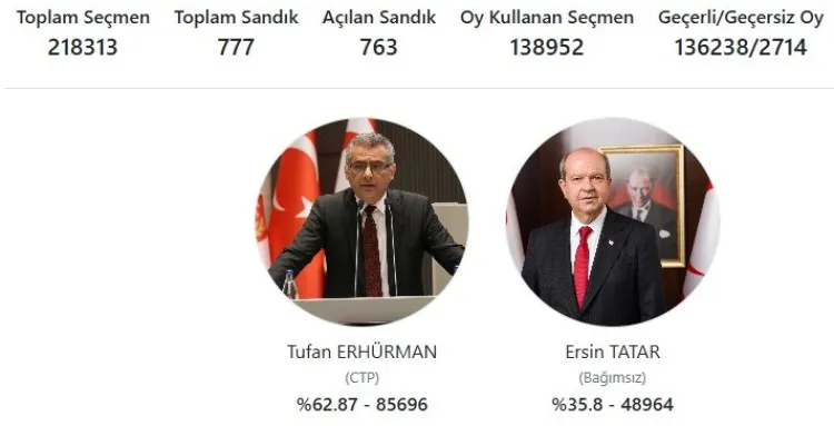 KKTC (İGFA) - Kuzey Kıbrıs Türk Cumhuriyeti (KKTC) 'nde bugün gerçekleşen Cumhurbaşkanlığı seçiminde, resmi olmayan sonuçlara göre CTP adayı Tufan Erhürman, oyların yüzde 62,76'sını alarak yeni Cumhurbaşkanı seçilirken, mevcut Cumhurbaşkanı Ersin Tatar yüzde 35,80 oyda kaldı.