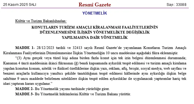 ANKARA (İGFA) - Kültür ve Turizm Bakanlığı, 28 Aralık 2023'te yayımlanan "Konutların Turizm Amaçlı Kiralanması Faaliyetlerinin Düzenlenmesine İlişkin Yönetmelik"te değişikliğe gitti.