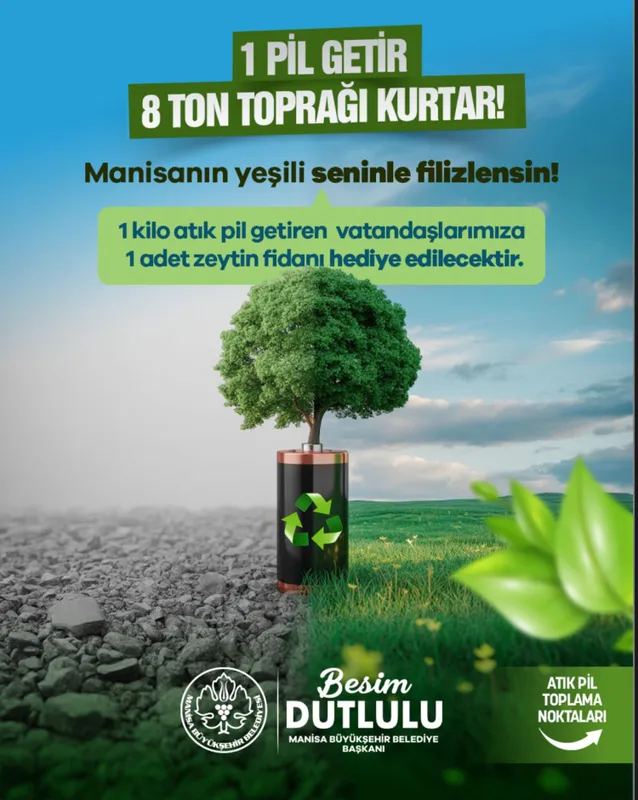 Manisa Büyükşehir Belediyesi, çevreye duyarlı vatandaşları kampanya noktalarına davet ederek, "Bir pil getir, bir fidan dik — doğa nefes alsın" mesajı verdi.