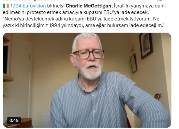 İrlandalı şarkıcı Charlie McGettigan, İsrail'in 2026 Eurovision Şarkı Yarışması'na katılmasına izin verilmesine  tepki olarak 1994'te kazandığı ödülünü iade edeceğini açıkladı.