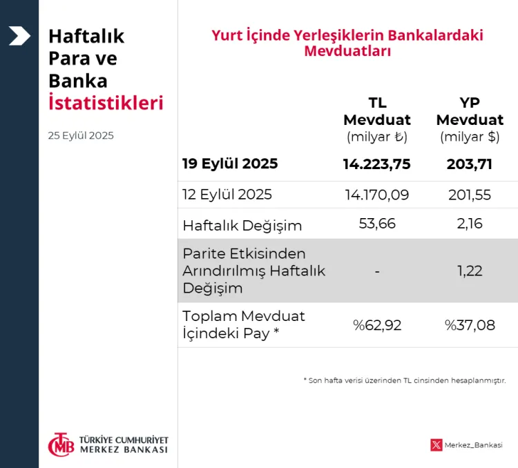 Verilere göre, 19 Eylül 2025 itibarıyla brüt döviz rezervleri 599 milyon dolar artışla 84 milyar 499 milyon dolardan 85 milyar 98 milyon dolara yükseldi. Aynı dönemde altın rezervleri 394 milyon dolar artarak 93 milyar 361 milyon dolardan 93 milyar 755 milyon dolara ulaştı.