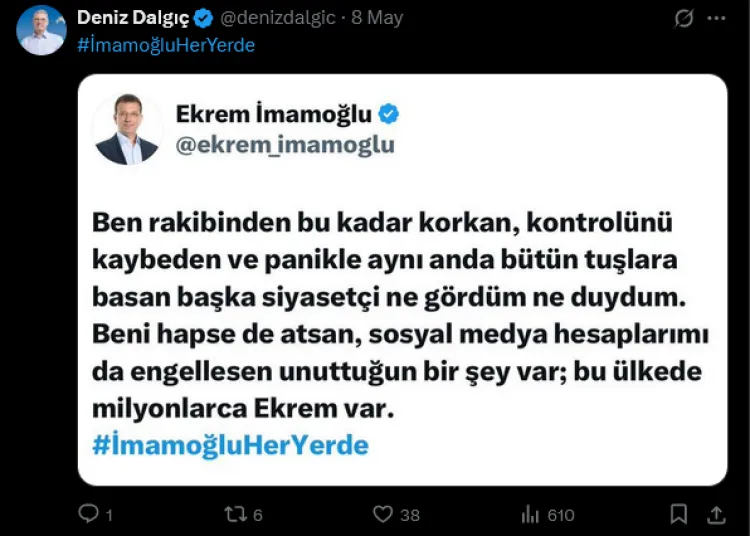 Başkan Dalgıç'ın paylaşımı, İmamoğlu'nun tutuklu yargı süreci ve CHP içindeki dayanışma mesajlarına atıfla, sosyal medyada hızlıca yayılırken, hesabından belediye çalışmalarını yeniden paylaşmaya başladı.