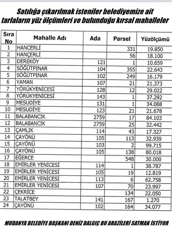 Satışa konu parsellerin ilçenin kırsal mahallelerinden Çayönü, Yörükyenicesi, Emirleryenicesi, Söğütpınar, Yaman, Eğerce, Dereköy, Hançerli, Mesudiye, Çekrice, Trilye ve Balabancık'taki tarlalar olduğunu belirten AK Parti Mudanya İlçe Başkanı Av. Arif Bayrak, "Bunlar köylünün, çiftçinin nefesi; Mudanya'nın gıda güvenliği ve ekonomisinin teminatı. 'Atıl' diye değersizleştirerek satmak, yarın üretimden, kırsaldan bahsetme hakkını da elinizden alacak" diyerek sert çıktı.