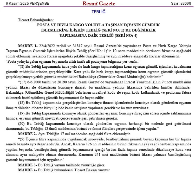"Posta ve Hızlı Kargo Yoluyla Taşınan Eşyanın Gümrük İşlemlerine İlişkin Tebliğ (Seri No: 1)" üzerinde yapılan değişiklikler, Resmî Gazete'nin bugünkü sayısında yayımlandı.
