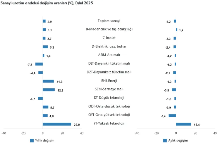2025 Eylül'de sanayi üretimi aylık yüzde 2,2 gerilerken, alt sektörlerde performans karışık seyretti.