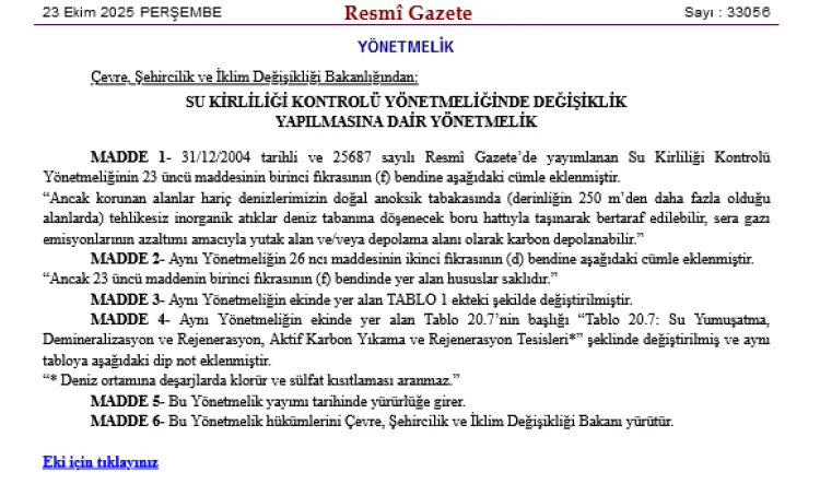 Bugünkü Resmi Gazete'de yayımlanan değişikliklerle, denizlerimizde atık bertarafı ve karbon depolama konularında yeni hükümler getirildi.
