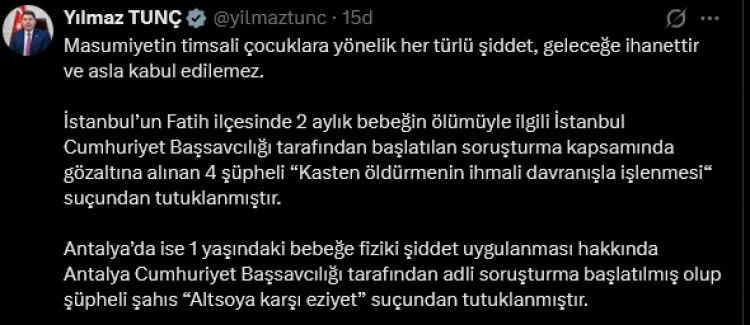 İstanbul'un Fatih ilçesinde 2 aylık bir bebeğin ölümüyle ilgili başlatılan soruşturma kapsamında gözaltına alınan 4 şüphelinin, "Kasten öldürmenin ihmali davranışla işlenmesi" suçundan tutuklandığını duyuran Bakan Tunç, Antalya'da ise 1 yaşındaki bir bebeğe uygulanan fiziki şiddet olayında adli soruşturma başlatıldığı ve şüpheli kişinin "Altsoya karşı eziyet" suçundan tutuklandığı açıkladı.