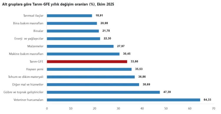TÜİK verilerine göre Tarımsal Girdi Fiyat Endeksi ekim ayında aylık yüzde 2,04, yıllık yüzde 33,66 artış gösterdi. En yüksek artış veteriner harcamalarında yaşandı.