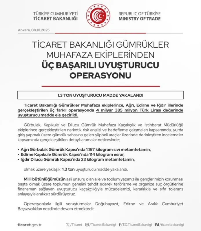Ticaret Bakanlığı Gümrükler Muhafaza ekipleri, Ağrı, Edirne ve Iğdır'da düzenlediği operasyonlarda 4 milyar 385 milyon TL değerinde 1.3 ton uyuşturucu madde yakaladı. Gürbulak'ta bin 167 kg sıvı metamfetamin, Kapıkule'de 114 kg esrar, Dilucu'da 23 kg metamfetamin ele geçirildi.