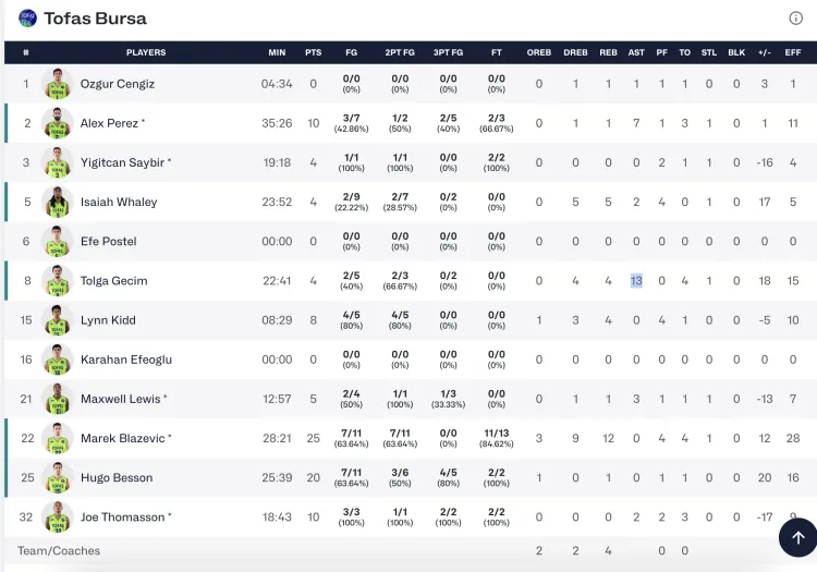 Herzliya karşısında TOFAŞ'ta Marek Blazevic 25 sayı; Hugo Besson 20 sayı; Alex Perez ve Joe Thomasson ise 10'ar sayıyla oynadı.