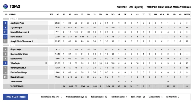 Fenerbahçe Beko karşısında TOFAŞ'ta Marek Blazevic 21 sayı; Yiğitcan Saybir 16 sayı; Lynn Kidd 14 sayı kaydetti.