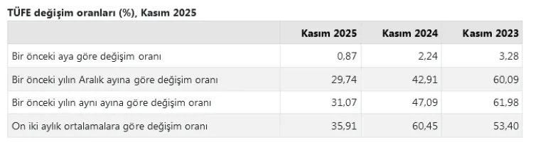 Buna göre TÜFE, Kasım'da bir önceki aya göre yüzde 0,87, bir önceki yılın aynı ayına göre ise yüzde 31,07 arttı. Yılbaşından bu yana artış oranı yüzde 29,74, on iki aylık ortalamalara göre artış ise yüzde 35,91 olarak gerçekleşti.