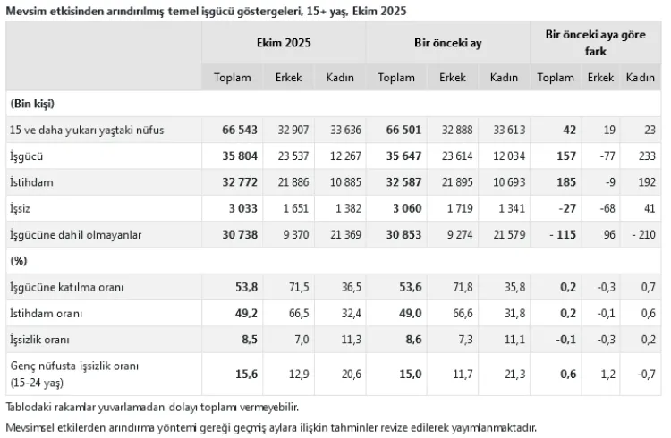 İşgücü, bir önceki aya göre 157 bin kişi artarak 35 milyon 804 bin kişi oldu. İşgücüne katılma oranı ise yüzde 53,8 olarak açıklandı. Erkeklerde katılım oranı yüzde 71,5, kadınlarda yüzde 36,5 seviyesinde gerçekleşti. 15-24 yaş grubundaki genç nüfusta işsizlik oranı, bir önceki aya göre 0,6 puan artarak yüzde 15,6 seviyesine çıktı. Genç işsizliği erkeklerde yüzde 12,9, kadınlarda yüzde 20,6 olarak tahmin edildi.