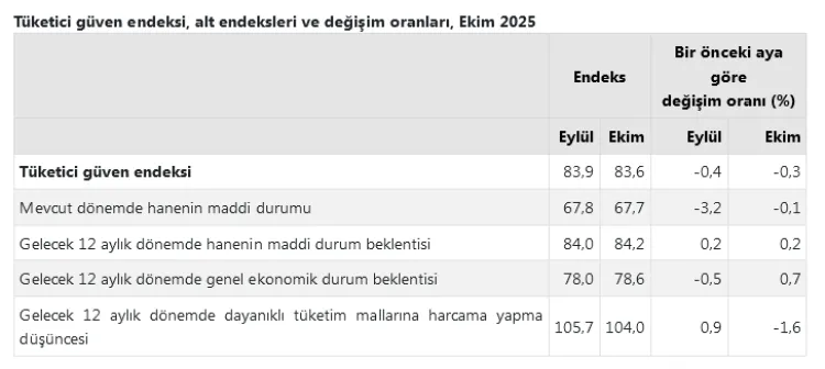 Türkiye İstatistik Kurumu (TÜİK) ile Türkiye Cumhuriyet Merkez Bankası iş birliğiyle yürütülen tüketici eğilim anketi sonuçlarına göre, tüketici güven endeksi Ekim ayında bir önceki aya göre yüzde 0,3 azalarak 83,6 seviyesine geriledi.