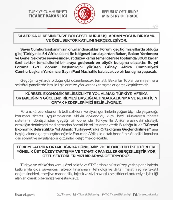 Ticaret Bakanlığı, "Türkiye-Afrika İlişkilerini Güçlendirerek Ortak Kazanımları Paylaşmak" mottosuyla V. Türkiye-Afrika İş ve Ekonomi Forumu, 16-17 Ekim 2025'te İstanbul Kongre Merkezi'nde (ICEC) düzenlenecek. Forum heyecanını paylaşan Bakanlık, Afrika ülkeleriyle ekonomik iş birliğini güçlendirmeyi hedeflediklerini kaydetti.