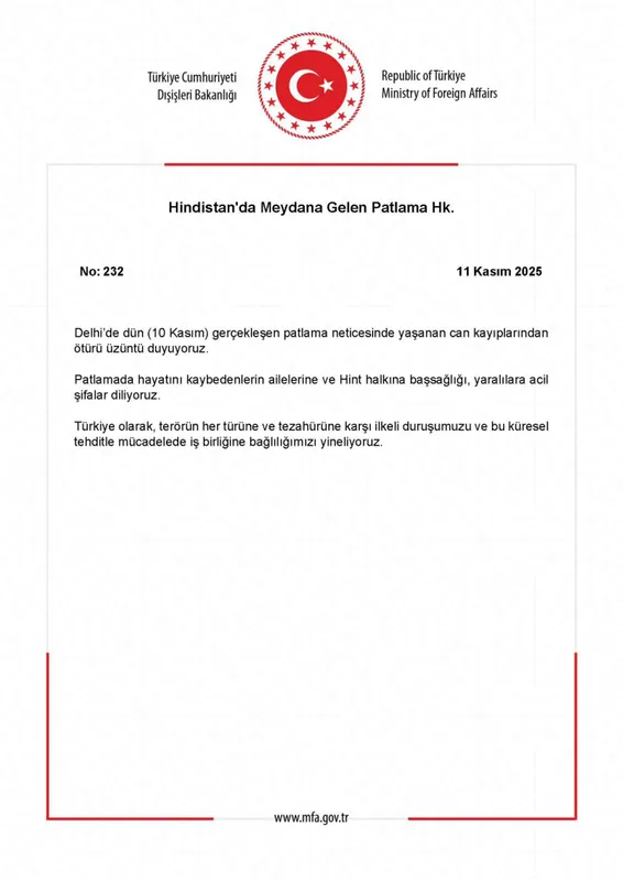 ANKARA (İGFA) - Dışişleri Bakanlığı, Hindistan'ın başkenti Delhi'de 10 Kasım'da gerçekleşen patlamayla ilgili resmi bir açıklama yaptı. Bakanlık, patlamada hayatını kaybedenlerin ailelerine ve Hint halkına başsağlığı, yaralılara ise acil şifalar diledi.