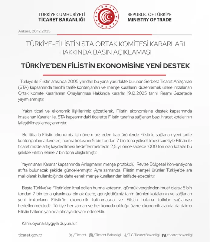 Ticaret Bakanlığı, Türkiye–Filistin Serbest Ticaret Anlaşması kapsamında tercihli tarife kontenjanları ve menşe kurallarını düzenleyen Ortak Komite Kararlarının Resmi Gazete'de yayımlandığını açıkladı. Kararlarla Filistin lehine önemli iyileştirmeler yapıldı.