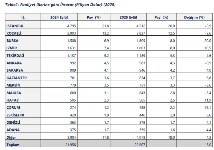 Küresel zorluklara rağmen 46 ilde ihracat artışı kaydedilirken, 27 il 1 milyar doların üzerinde ihracat gerçekleştirdi. Eylül'de Bursa, en fazla artışla öne çıktı.