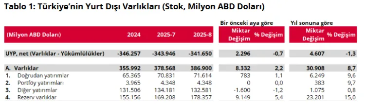 Türkiye'nin net UYP'si -341,7 milyar ABD doları olarak kaydedildi. Yurt dışı varlıklar yüzde 2,2 artışla 386,9 milyar dolara, yükümlülükler yüzde 0,8 artışla 728,6 milyar dolara yükseldi. Rezerv varlıklar rekor 178,4 milyar dolara ulaştı; doğrudan yatırımlar 71,6 milyar dolara, portföy yatırımları 127,9 milyar dolara çıktı.