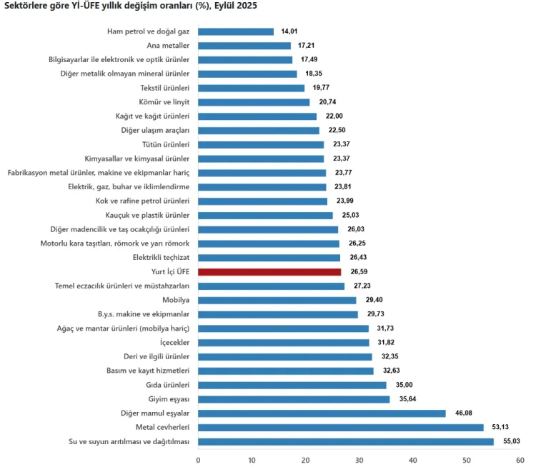 Yurt İçi Üretici Fiyat Endeksi (Yİ-ÜFE) Eylül'de yıllık yüzde 26,59, aylık ise yüzde 2,52 artış kaydetti. Su temininde yıllık yüzde 55,03 artış yaşanırken, ana sanayi gruplarında yıllık en fazla artış yüzde 33,21 ile dayanıksız tüketim malları oldu.