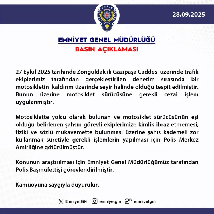 Zonguldak'ta Gazipaşa Caddesi'nde kaldırımda seyreden motosiklet sürücüsüne ceza kesildi. Motosiklette yolcu olan sürücünün eşi, kimlik göstermeyip polise fiziki ve sözlü mukavemette bulununca Polis Merkezi'ne götürüldü. Emniyet Genel Müdürlüğü, olayla ilgili Polis Başmüfettişi görevlendirdi.