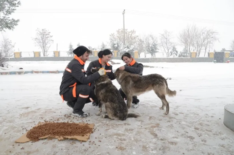 Diyarbakır Büyükşehir Belediyesi, yoğun kar yağışı nedeniyle sokak hayvanlarının aç kalmaması için kent genelinde belirlediği 50 noktaya mama bıraktı.